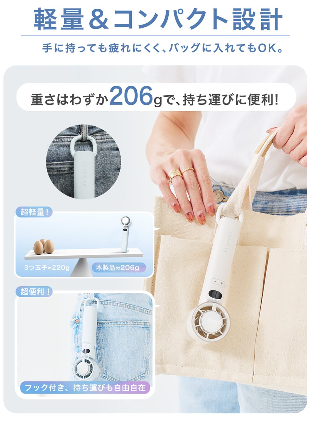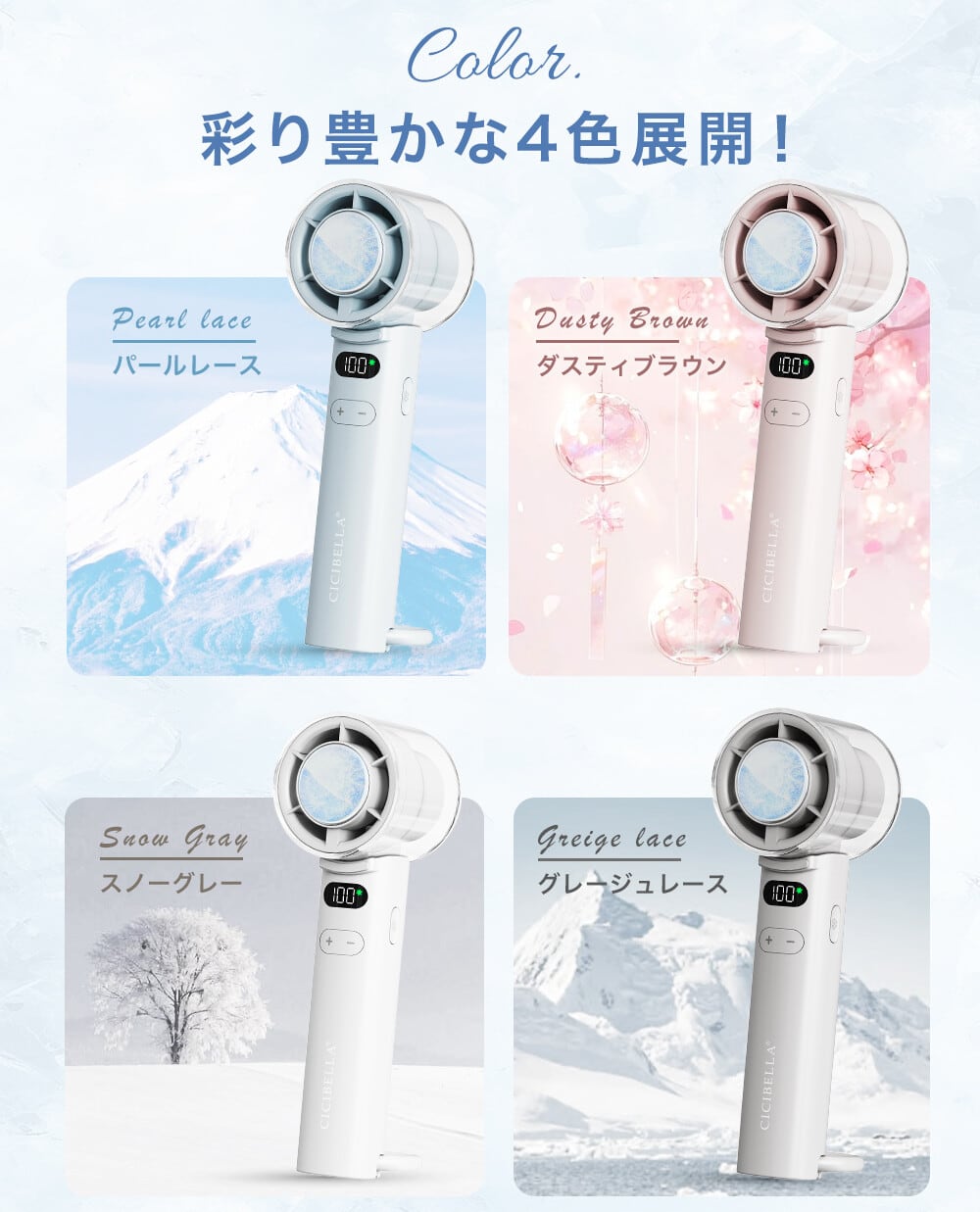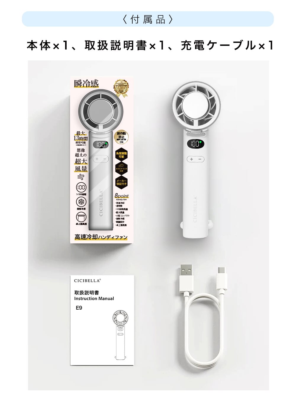 \2025夏新登場/CICIBELLA 高速冷却ハンディファン100段階の風量調整 × 強力冷却プレート搭載!片手で持ちやすいコンパクト設計ながら、3000mAh大容量バッテリー で長時間使用可能!風量は1〜100段階まで細かく調整できるので、通勤・オフィス・アウトドアなどあらゆるシーンで最適な涼しさを提供します。POINT強力冷却プレート搭載100段階の風量調整USB Type-C急速充電軽量&コンパクトファンのみ使用なら最長13時間連続運転可能!ファン + 冷却機能を使っても、最長 2時間 の冷却パワー!